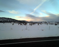 Tons of Snow this Winter! 12 inches one morning. @ hour Delay and school was still on. Look what we found as we headed for school on hwy 180 a herd of Elk. They were unbelievable!